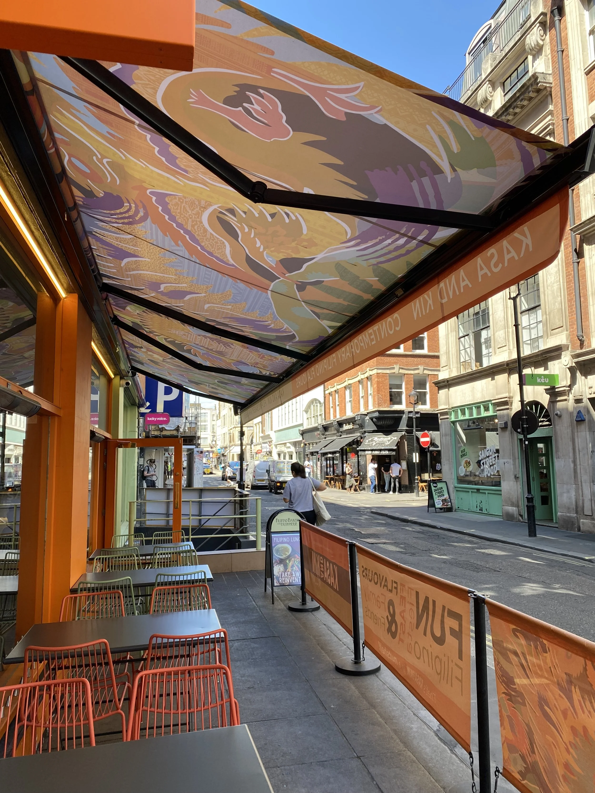 Outdoor seating area of a restaurant with orange chairs, tables, and a colorful awning, on a city street with pedestrians and buildings.