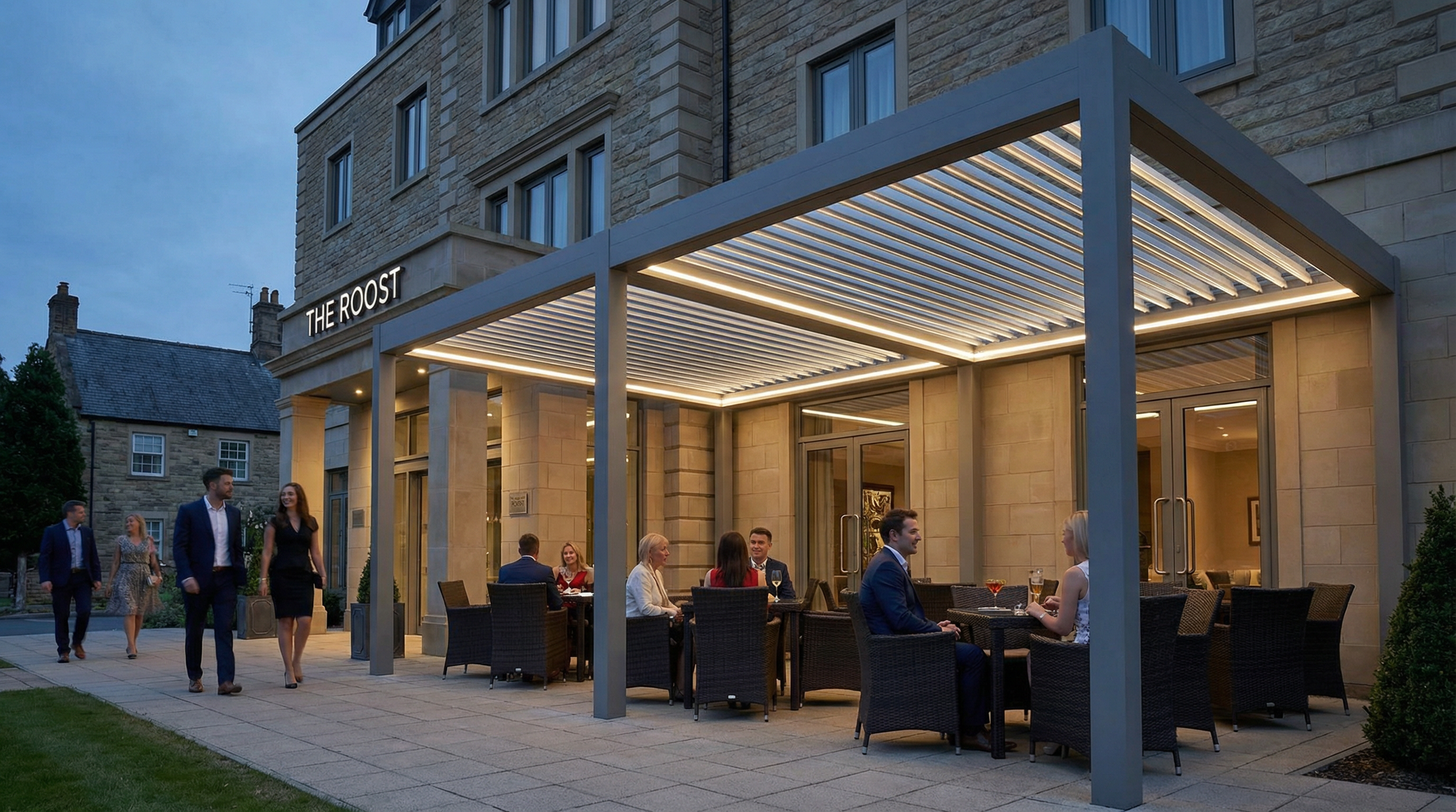 Transform outdoor space with a retractable canopy. For restaurants, bars & hotels they provide adjustable sun & rain protection creating stylish, functional seating areas that enhance aesthetics & maximise customer comfort.